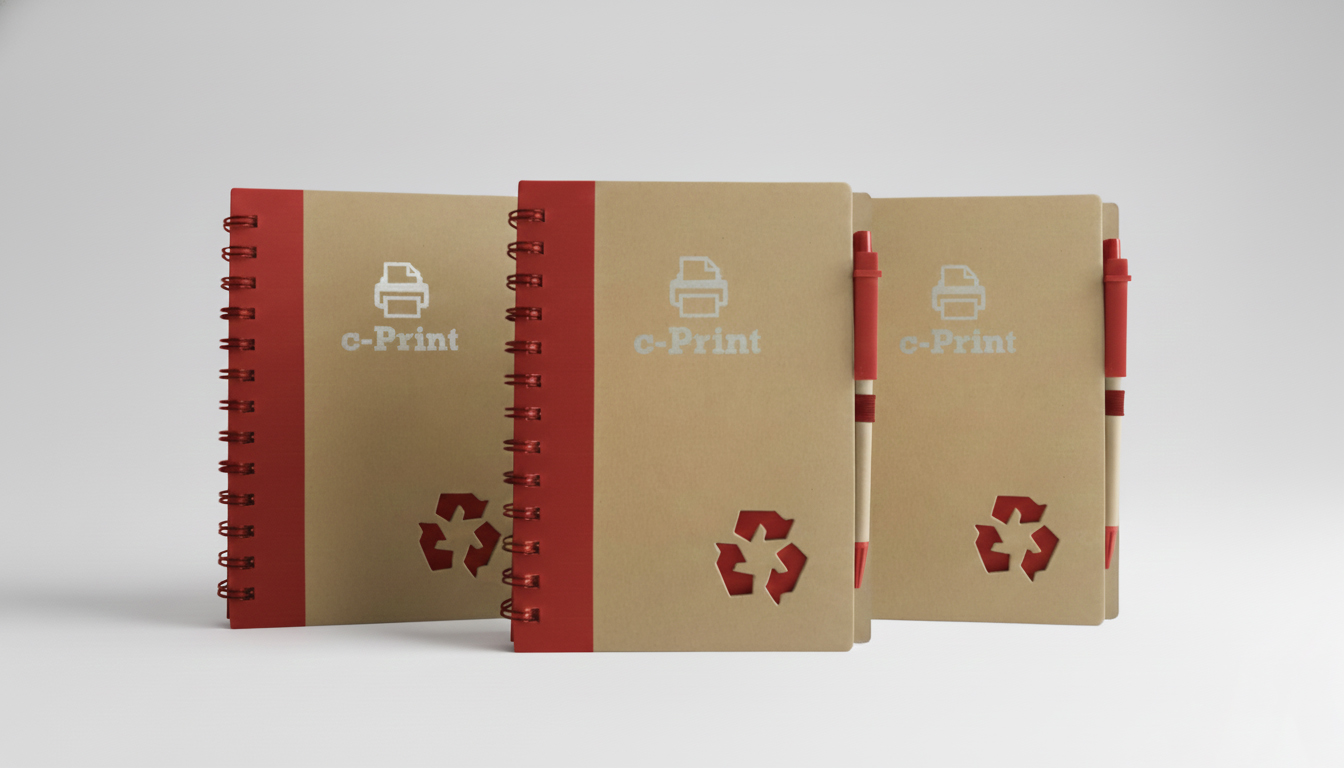 Estas libretas corporativas añaden un toque ecológico a tu evento o presentación. Fabricado con papel reciclado, este cuaderno de tapa dura tiene un lomo de alambre en espiral, 70 hojas que ofrecen 140 páginas rayadas para escribir. Incluye una presilla elástica con bolígrafo de papel reciclado, punta de colores brillantes, ribete y clip, y tinta alemana negra. Disponible en colores lisos y empaquetado en una bolsa de celofán.